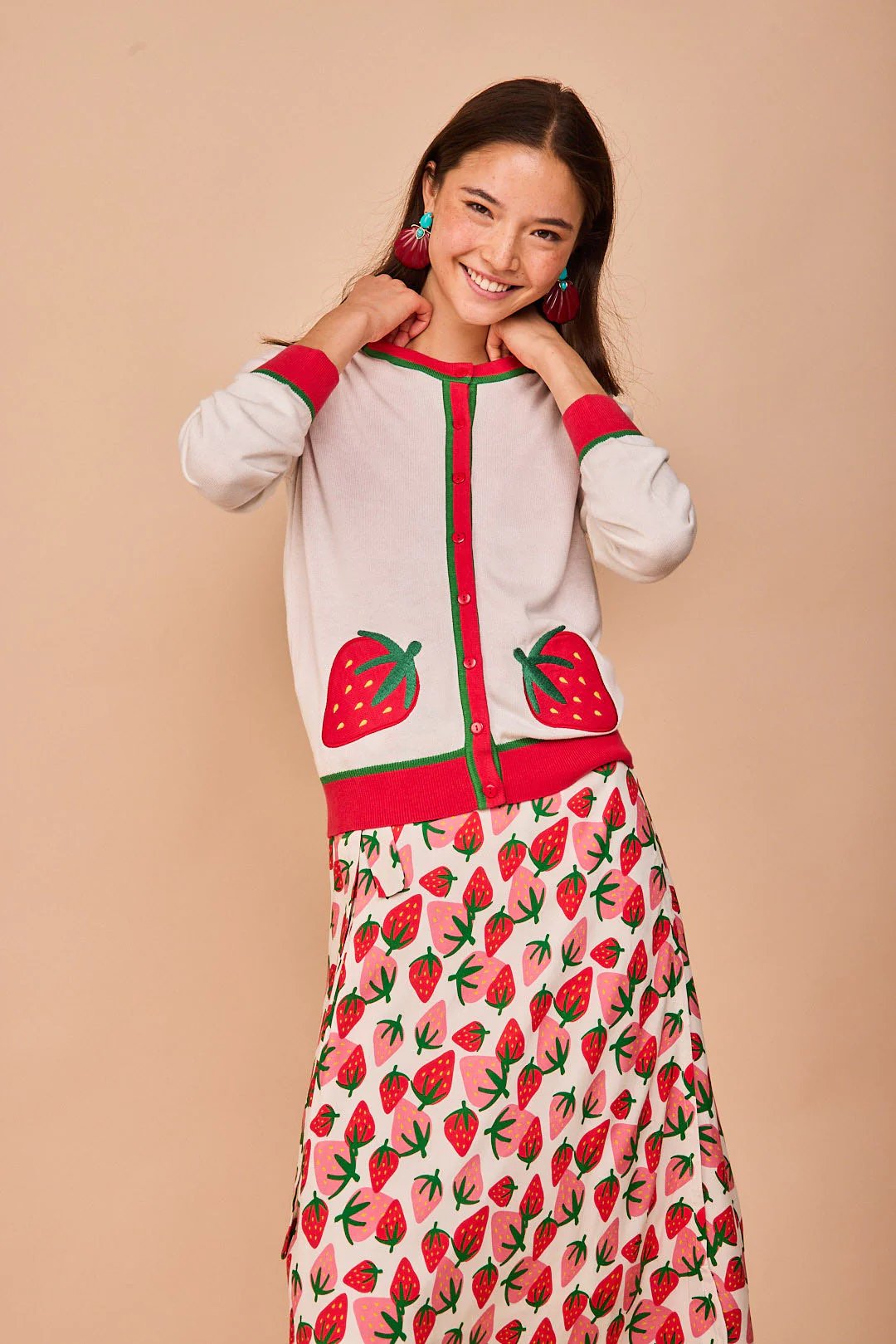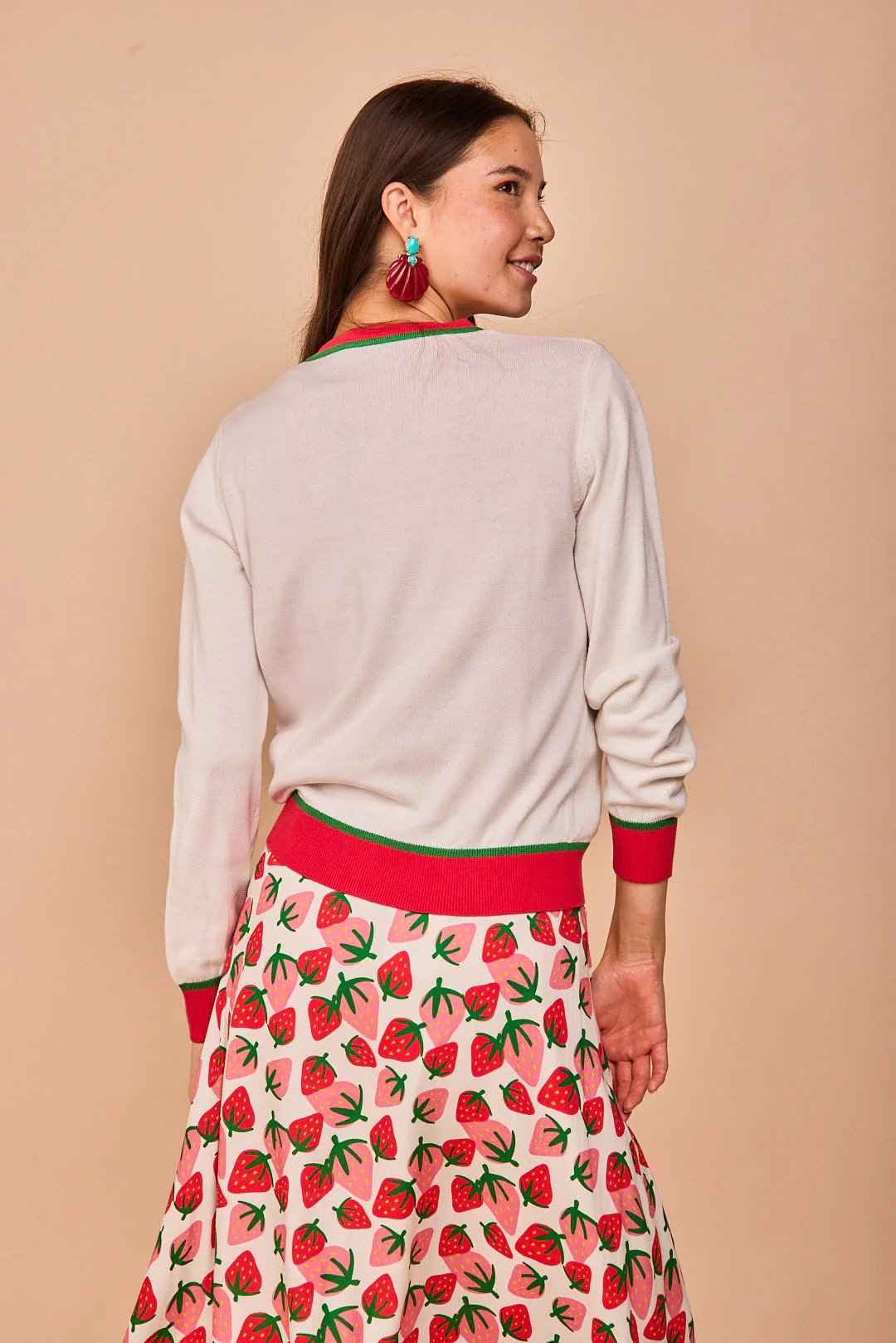 Chaqueta de punto con bordado de fresa . Manga larga. Bordes canalados.