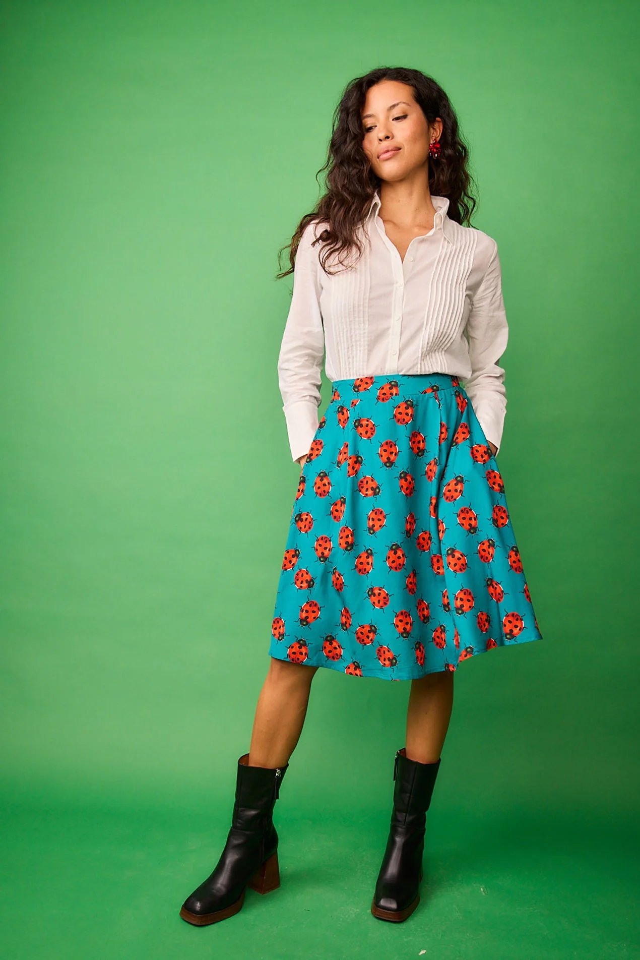 Falda corta con cintura elástica en la parte de la espalda, con mucho vuelo.