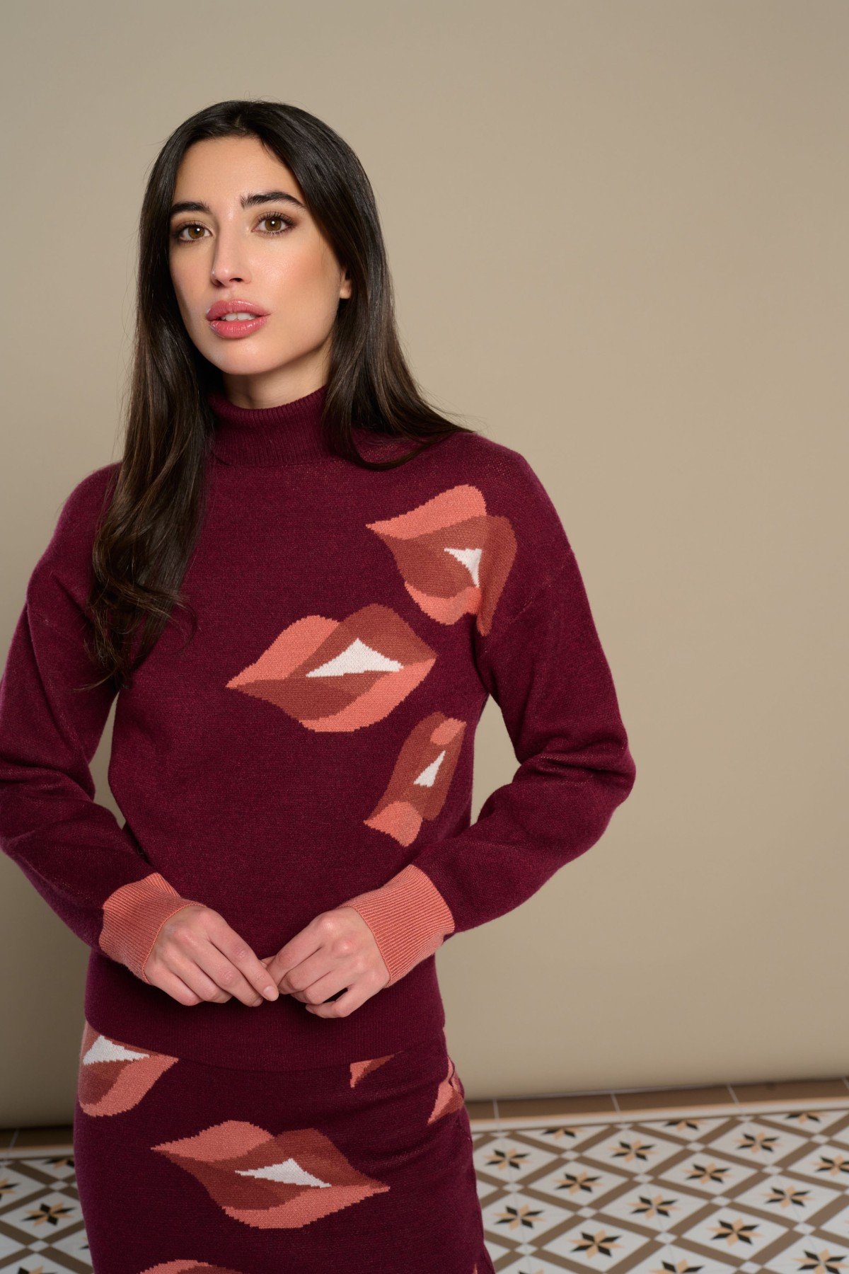 Jersey de punto con cuello redondo y manga larga. Cuello, cintura y mangas en rib. Estampado labios. Tejido elástico.