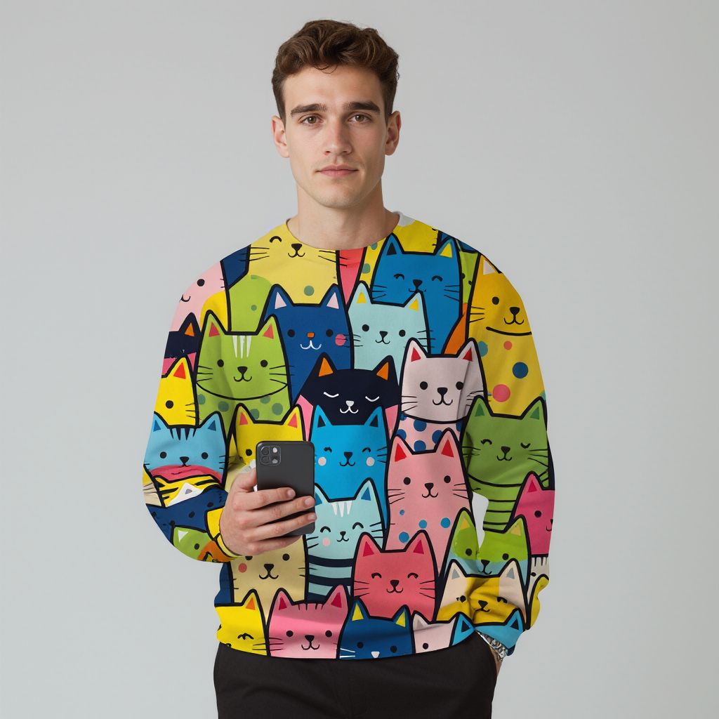Suéter de Hombre con Estampado 3D de Cara de Gato - Diseño Colorido de Gatito con Ojos Expresivos, Tejido Suave y Ajuste Holgado para Gimnasio, Exterior y Casual. Cómodo Todo el Año (Lavable a Máquina, Regalo Ideal para Amantes de los Gatos)
