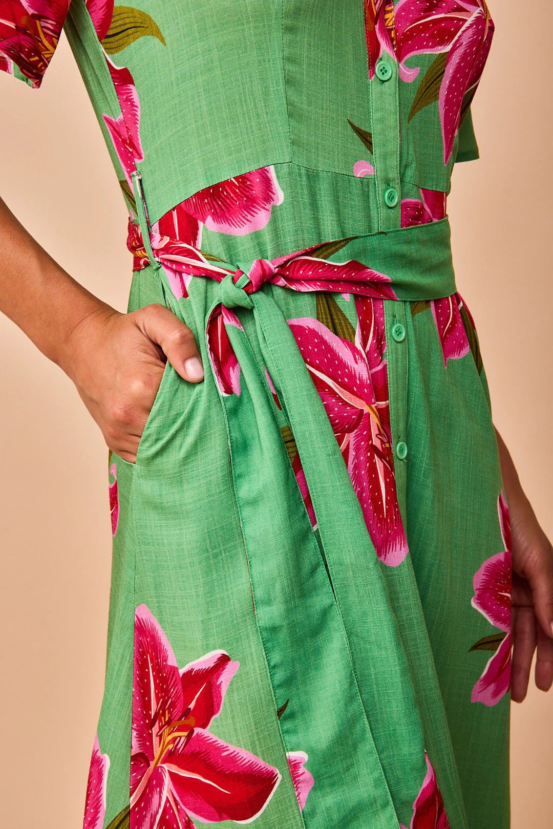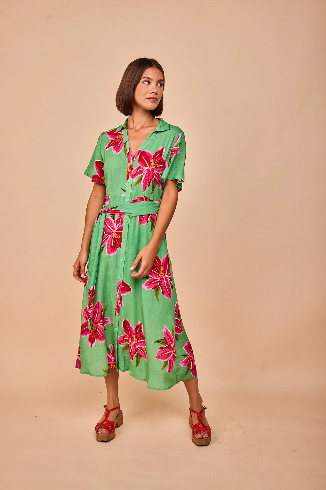 Vestido camisero con cuello de pico, bolsillos y cinturón.