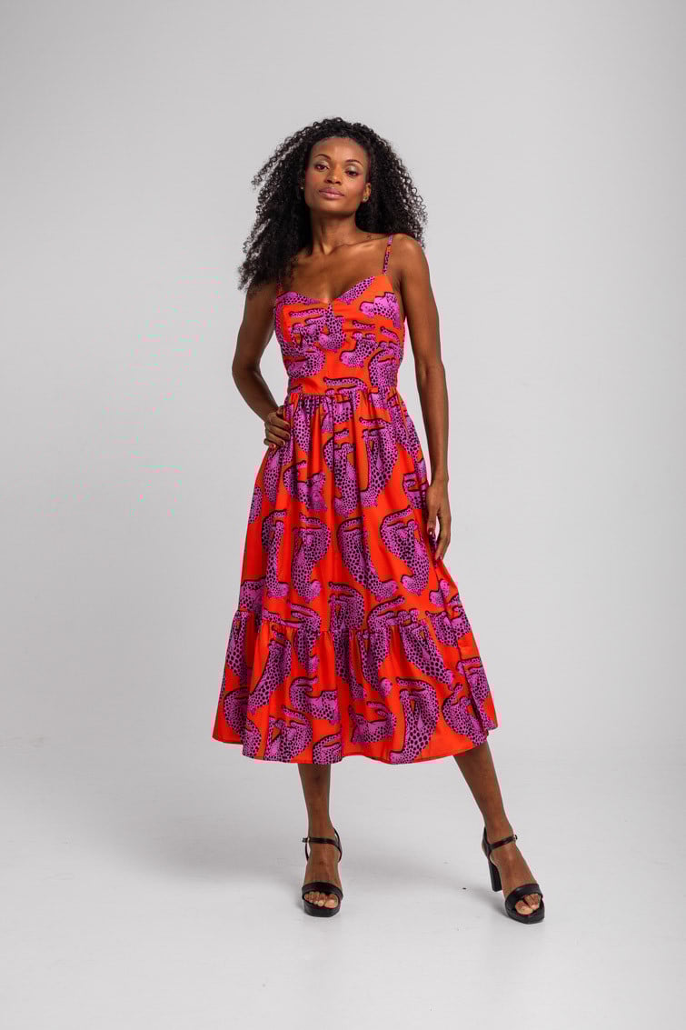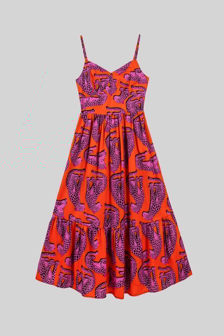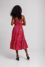 Vestido midi en tejido fluido de tirantes finos espagueti. Cuerpo tipo bustier con cortes en copa y costadillos que aportan estructura. Cintura definida y falda fluida con volante ancho fruncido en el bajo.